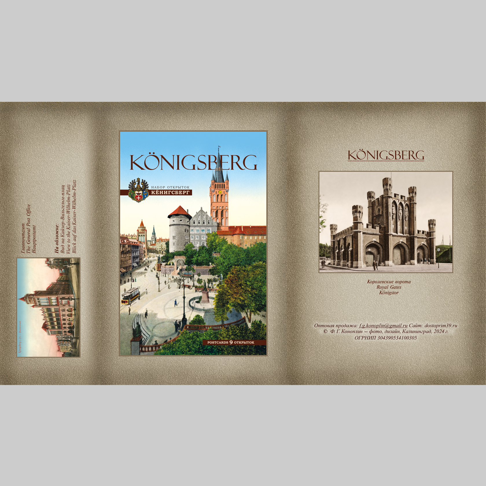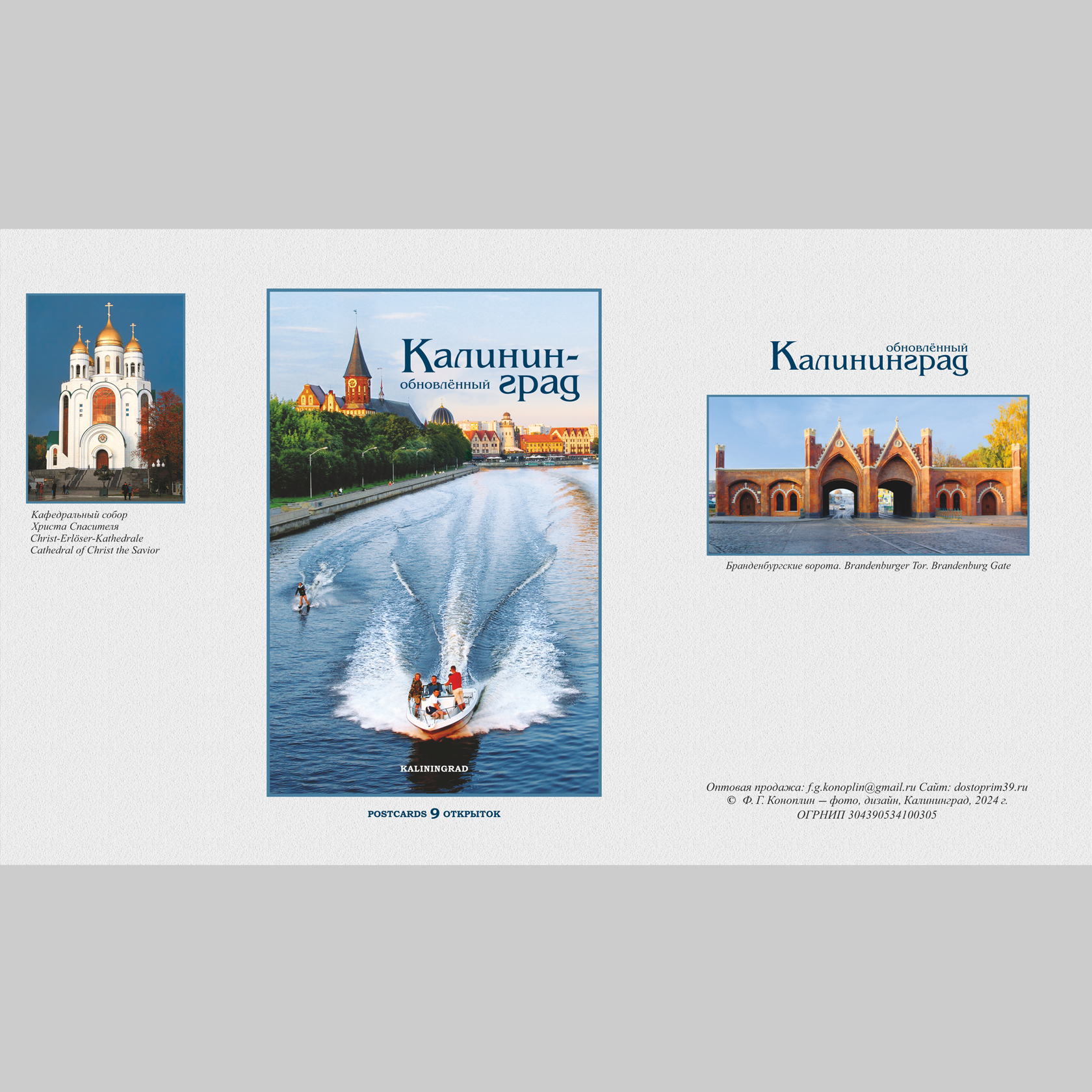 Содержит 9 цветных открыток. Здесь представлен разворот обложки набора. Русский, английский, немецкий язык.