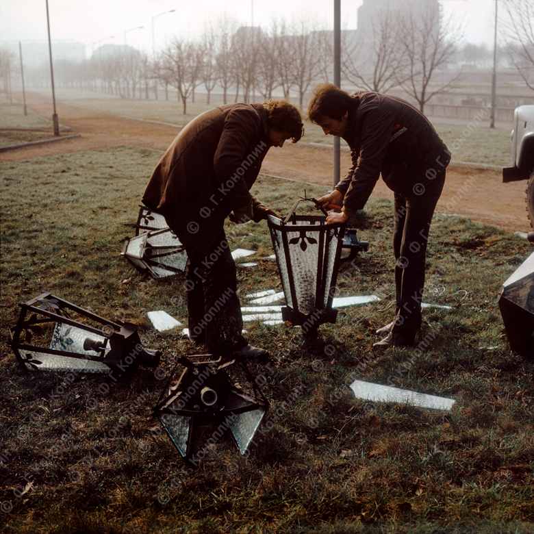 Ремонт осветителей. На заднем плане набережная реки Преголи и Кафедральный собор.